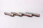 Vier blikken rijtuigen in tee kleurstelling. Het gaat om twee 1e klas coupérijtuigen, een panoramarijtuig en een dsg speisewagen. Lees meer...