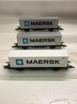3 x 2 axle containerwagen bauart lgns der db, totale lengte 170mm, nem 362 normen en kortkoppeling, epoch iv beladen met 2 x 40 te Lees meer...