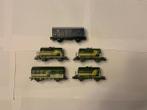 Mooie 4 delige set met alles erop en eraan. Groene lage bak hebben metalen chassis en 2 x 2 pallets. Wagons met contragewichten he Lees meer...