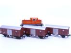 Geheel van in totaal 7 stuks goederenwagens van bemo voor smalspoor h0m. Gemengde trein met 4 gesloten wagen, 2 lageboordwagens en Lees meer...